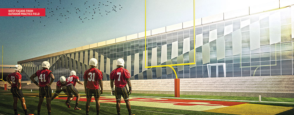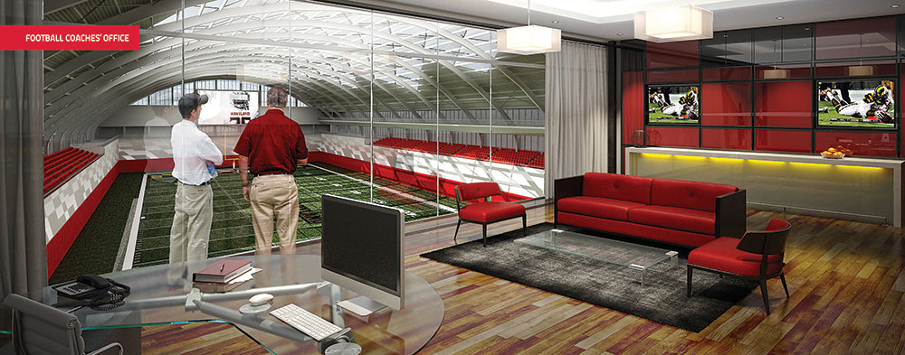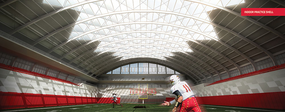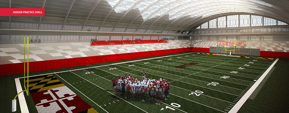 The Terrapin Performance Center will include a dynamic indoor football practice facility, strength and conditioning facilities, team locker room, meeting rooms and offices. Two outdoor turf fields will also be constructed on the west end of the facility. The fields will also be made available to all UMD students for intramural sports.